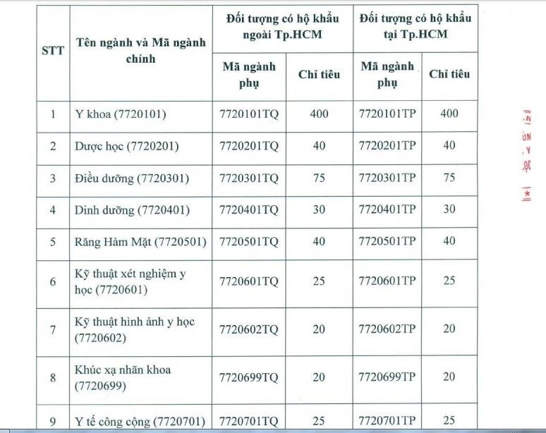 Chỉ tiêu của tất cả các ngành được phân bố 50% cho thí sinh có hộ khẩu TP.HCM và 50% còn lại dành cho thí sinh cả nước. Trường quy định mã ngành có ký tự "TQ" áp dụng cho thí sinh có hộ khẩu ngoài TP.HCM, mã ngành có ký tự "TP" áp dụng cho thí sinh có hộ khẩu TP.HCM.