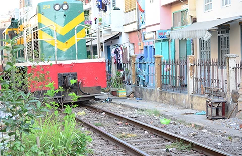Ranh giới thực tế của đường sắt qua TP hiện chỉ dưới 10 m, trong khi chỉ giới HLATĐS theo quy hoạch là 30 m nên nhà dân ở hai bên bị… treo luôn. Ảnh: Phước Tĩnh