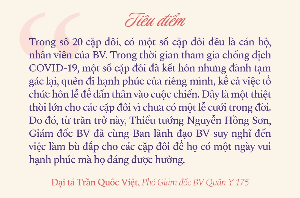 Sự kiện đám cưới tập thể dành cho những nhân viên y tế là một món quà rất đặc biệt. Đây là một chương trình rất ý nghĩa, cho thấy BV đã hiểu cho nỗi trăn trở của nhiều cặp đôi như mình. Đây không phải trách nhiệm, càng không phải là sự bù đắp vì đối với những người làm nghề y thì việc sát cánh cùng bệnh nhân là nhiệm vụ của mỗi người dù ở giai đoạn nào. Tôi thật sự biết ơn và trân trọng tình cảm của BV dành cho mình".