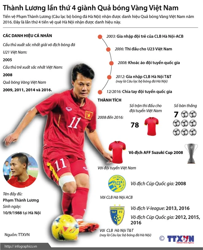 Tiền vệ Phạm Thành Lương (Câu lạc bộ bóng đá Hà Nội) nhận được danh hiệu Quả bóng Vàng Việt Nam năm 2016. Đây là lần thứ 4 tiền vệ quê Hà Nội nhận được danh hiệu này.