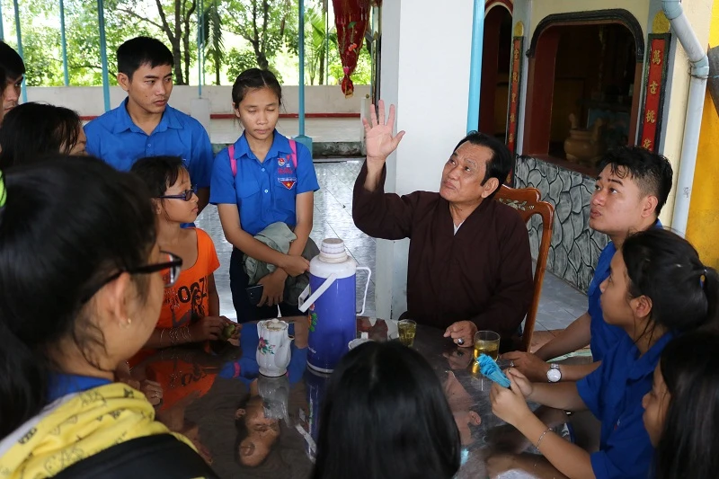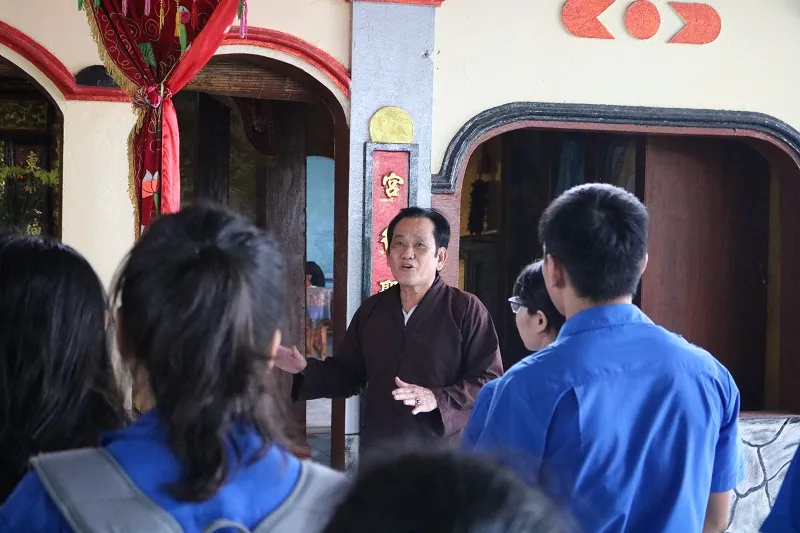 Chú Năm (người trông coi Miếu Ngũ Hành) đang giới thiệu về Miếu cho các bạn thiếu nhi. ẢNH: THANH TUYỀN.