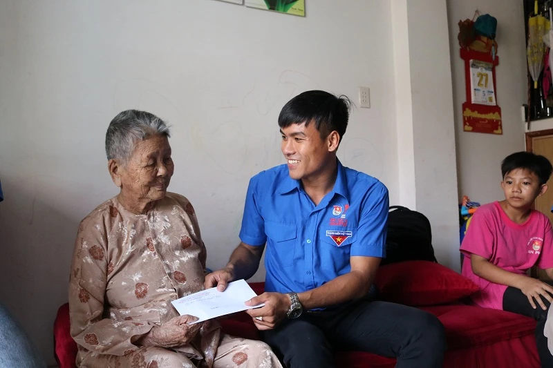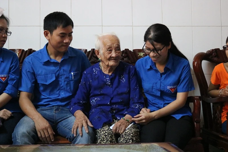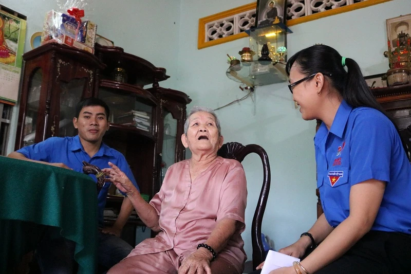 Thăm hỏi Mẹ Nguyễn Thị Ớt (8t tuổi). Trong cuộc kháng chiến chống Mỹ, chồng và con trai của mẹ đã hy sinh. ẢNH: THANH TUYỀN.