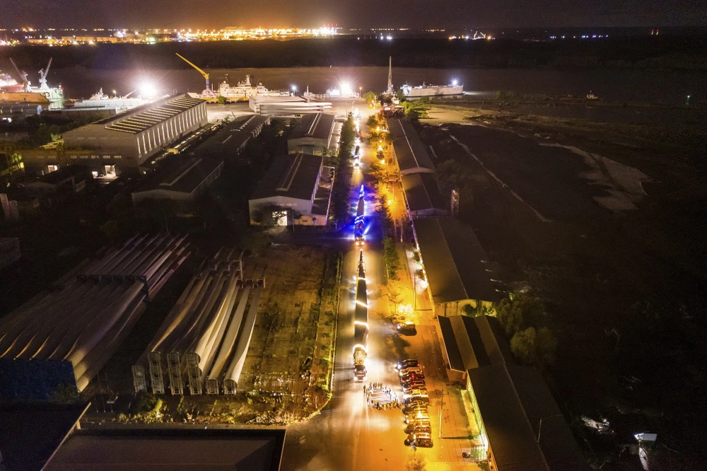 Đoàn xe siêu trường siêu trọng vận chuyển cánh quạt điện gió. Ảnh: Trungnam Group cung cấp