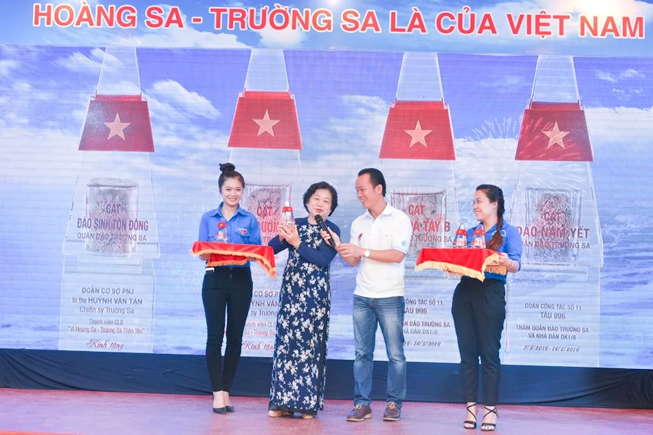 Bà Trương Mỹ Hoa và anh Huỳnh Văn Tẩn giới thiệu bộ sản phẩm tháp pha lê chứa cát sỏi mang về từ Trường Sa, bán đấu giá để gây quỹ cho CLB