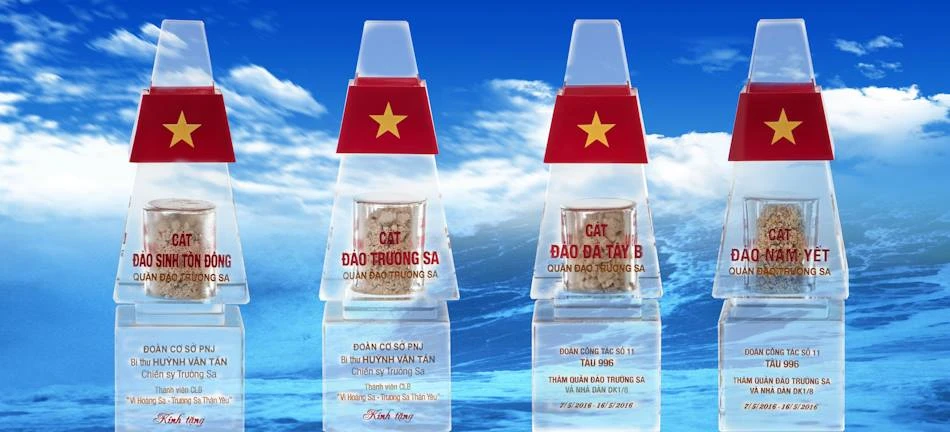 Bộ tháp pha lê chứa cát sỏi được mang về từ đảo Trường Sa, Nam Yết, Dát Lát và Sinh Tồn Đông