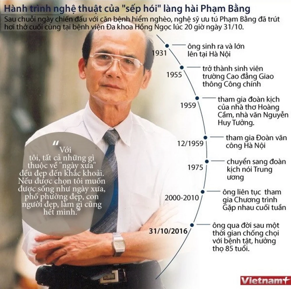 Thường vào vai các ông sếp đầu hói, ưa nịnh, nghệ sỹ Phạm Bằng đã để lại nhiều dấu ấn với công chúng, đặc biệt là qua các chương trình "Gặp nhau cuối tuần"./.