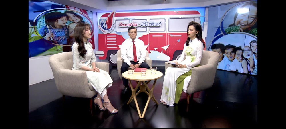 Ông Nguyễn Thanh Đạm và Hoa hậu Phí Thùy Linh tại trường quay chương trình “Trao cơ hội nối ước mơ”.
