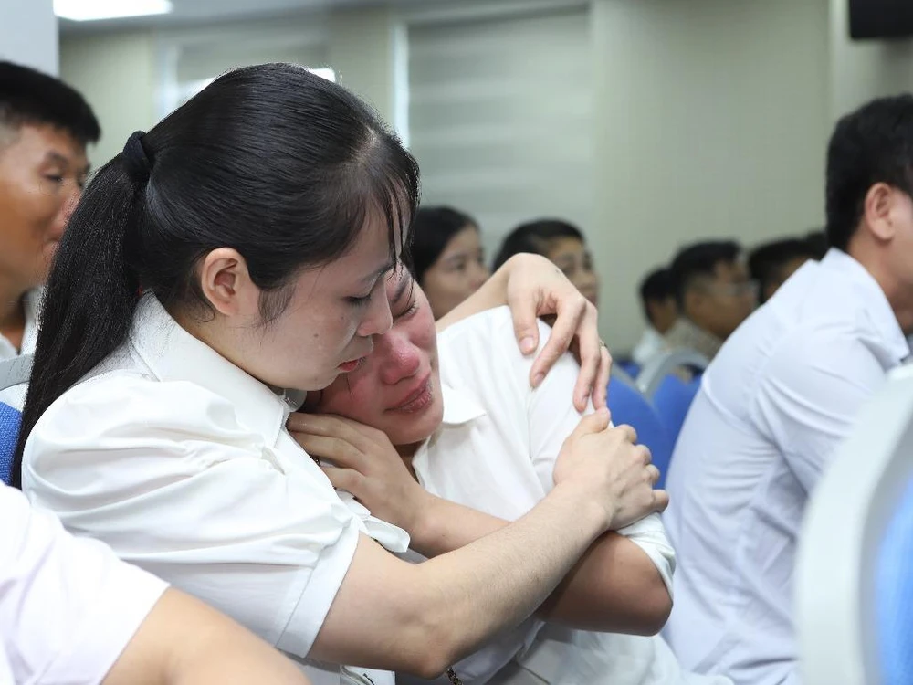 Vợ chồng Nga - Khải ôm nhau khi biết sẽ được hỗ trợ thụ tinh trong ống nghiệm. ẢNH: MINH THƯ