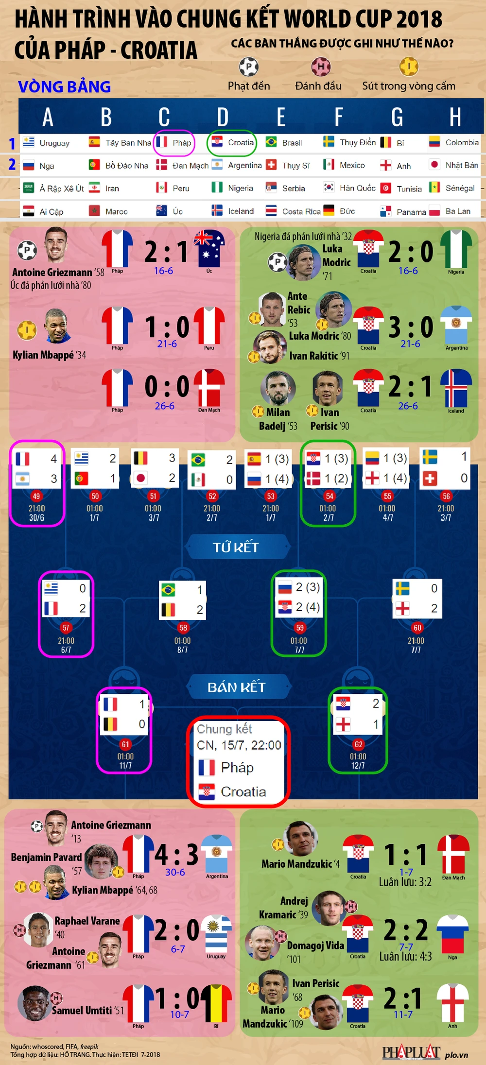 (PLO)- Cùng nhìn lại chặng đường dài từ vòng bảng vào đến chung kết World Cup 2018 của hai đội Pháp - Croatia. Dù rất cố gắng, đội tuyển Croatia đã thua Pháp 2-4 trong trận chung kết.