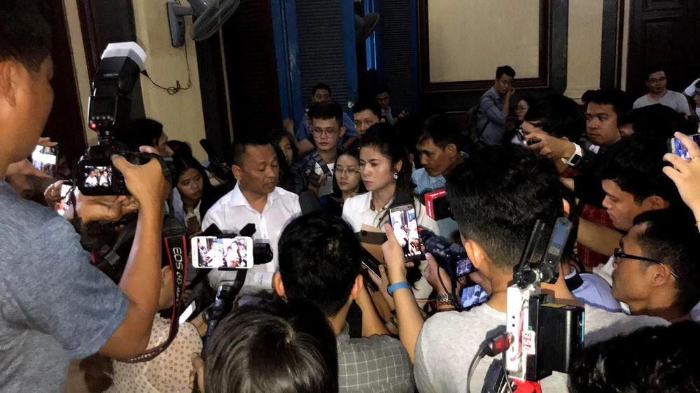 Bà Thảo trong vòng vây báo chí tại phiên xử ly hôn ồn ào mới đây.