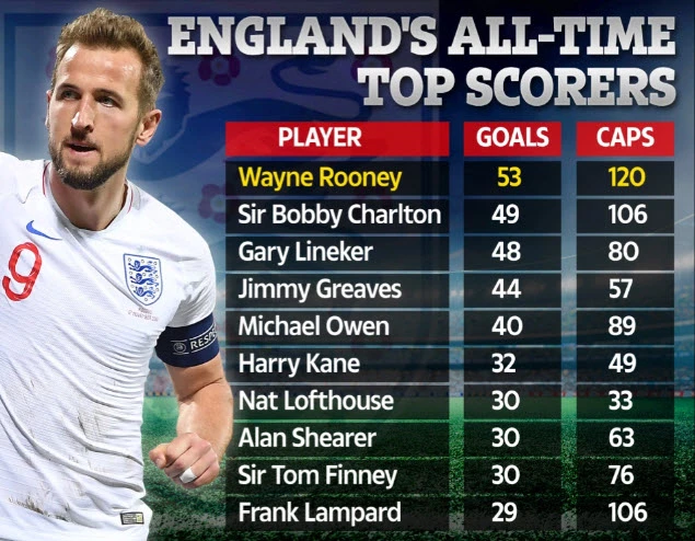 | Top 10 chân sút vĩ đại nhất lịch sử bóng đá Anh: 1- Wayne Rooney: 53 bàn/120 trận 2- Sir Bobby Charlton: 49 bàn/106 trận 3- Gary Lineker: 48 bàn/80 trận 4- Jimmy Greaves: 44 bàn/57 trận 5- Michael Owen: 40 bàn/89 trận 6- Harry Kane: 32 bàn/49 trận 7- Nat Lofthouse: 30 bàn/33 trận 8- Alan Shearer: 30 bàn/63 trận 9- Sir Tom Finney: 30 bàn/76 trận 10- Frank Lampard: 29 bàn/106 trận |