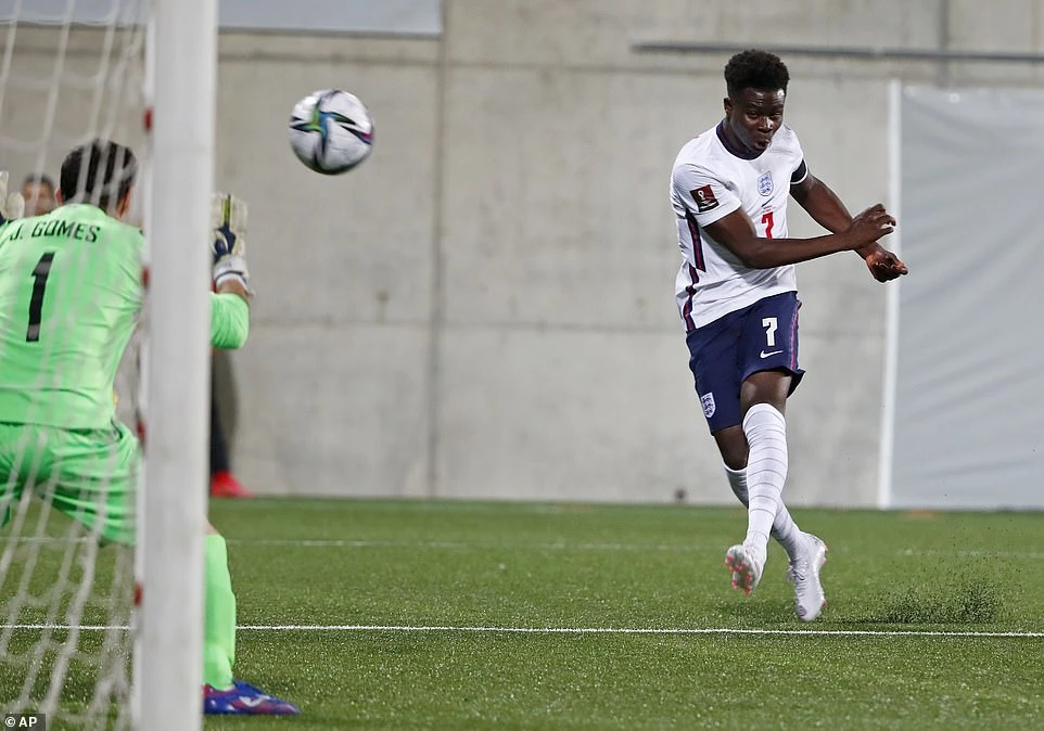 Chilwell mở tỷ số và Saka là người giúp tuyển Anh khép lại hiệp một với lợi thế dẫn trước 2-0. Ảnh: AP.