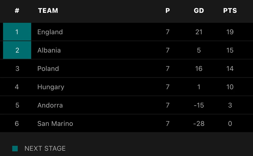 Với chiến thắng này, tuyển Anh giữ vững ngôi đầu bảng I với 19 điểm sau 7 vòng đấu. Kết quả hai trận đấu khác tại bảng I, Albania đánh bại chủ nhà Hungary với tỷ số 1-0, còn Ba Lan đại thắng San Marino 5-0.
