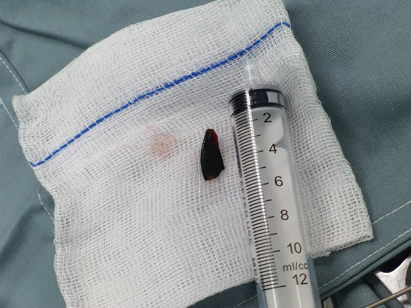 Kết quả CT Scan ngực cho thấy phế quản và viêm thùy dưới phổi phải bệnh nhân bị dãn, có dị vật nhánh phế quản thùy dưới phổi phải. Bệnh nhân được chỉ định nội soi phế quản thám sát ghi nhận niêm mạc phế quản nhiều giả mạc, có dị vật nằm trọn lòng phế quản phân thùy dưới phổi phải bị che lấp bằng giả mạc và niêm mạc phù nề. Bác sĩ lấy dị vật ra, tuy nhiên chỉ lấy được phần gai của hạt.