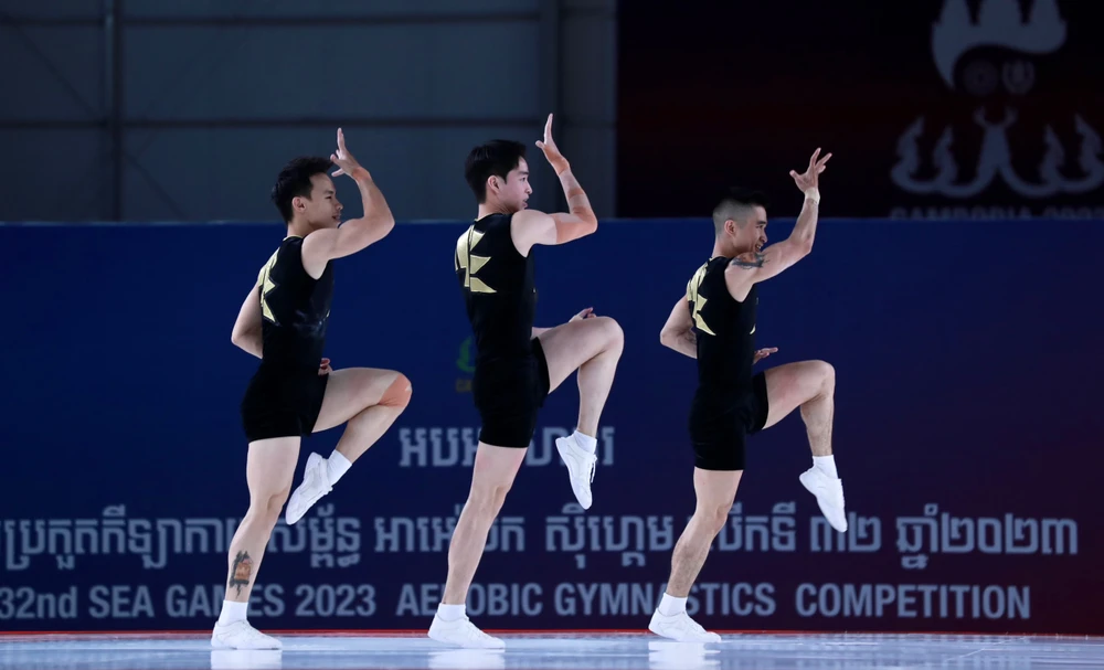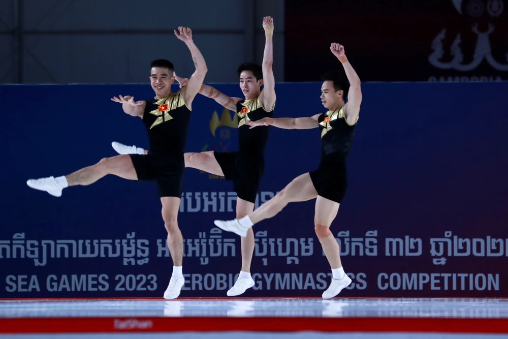 Sau đó, bộ ba Việt Nam Hoàng Gia Bảo, Lê Hoàng Phong, Nguyễn Chế Thanh hoàn tất cú hat-trick vàng của Aerobic khi vô địch nội dung nhóm ba người nam với tổng điểm 19,267. HCB thuộc về Thái Lan và HCĐ của chủ nhà Campuchia.