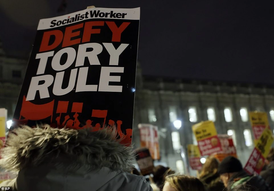 Những người biểu tình cầm theo bảng hiệu ghi các nội dung như “Khinh thường phe Bảo thủ”. Ảnh: Daily Mail
