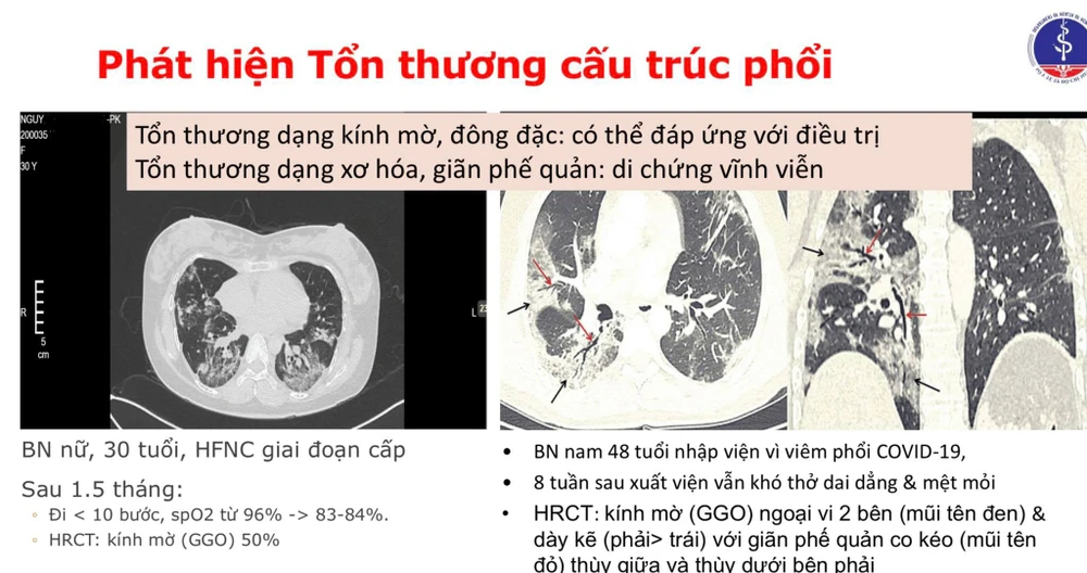 TS Nguyễn Anh Dũng dẫn chứng hai trường hợp có tổn thương vĩnh viễn phổi sau khi mắc COVID-19 và sức khỏe giảm sút. Trong đó, bệnh nhân nữ chỉ mới 30 tuổi, quá trình điều trị được can thiệp thở oxy liều cao (HFNC). Tuy nhiên, 6 tuần sau khi xuất viện, kết quả chụp CT lồng ngực phân giải cao của bệnh nhân vẫn ghi nhận những tổn thương dạng kính mờ rải rác chiếm 50% hai phế trường. Bệnh nhân còn mệt và suy nhược, chỉ cần đi chưa đến 10 bước là nồng độ oxy trong máu SpO2 từ bình thường tụt đến dưới 90% (từ 96 % tụt xuống còn 83 - 84%), mức có thể gây suy hô hấp.