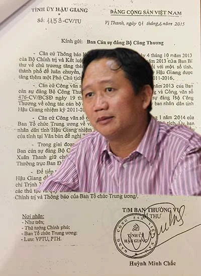 Đầu tháng 4-2015 Tỉnh ủy Hậu Giang có công văn gửi Ban Cán sự đảng Bộ Công Thương để xin đích danh ông Trịnh Xuân Thanh về công tác tại UBND tỉnh (ảnh).