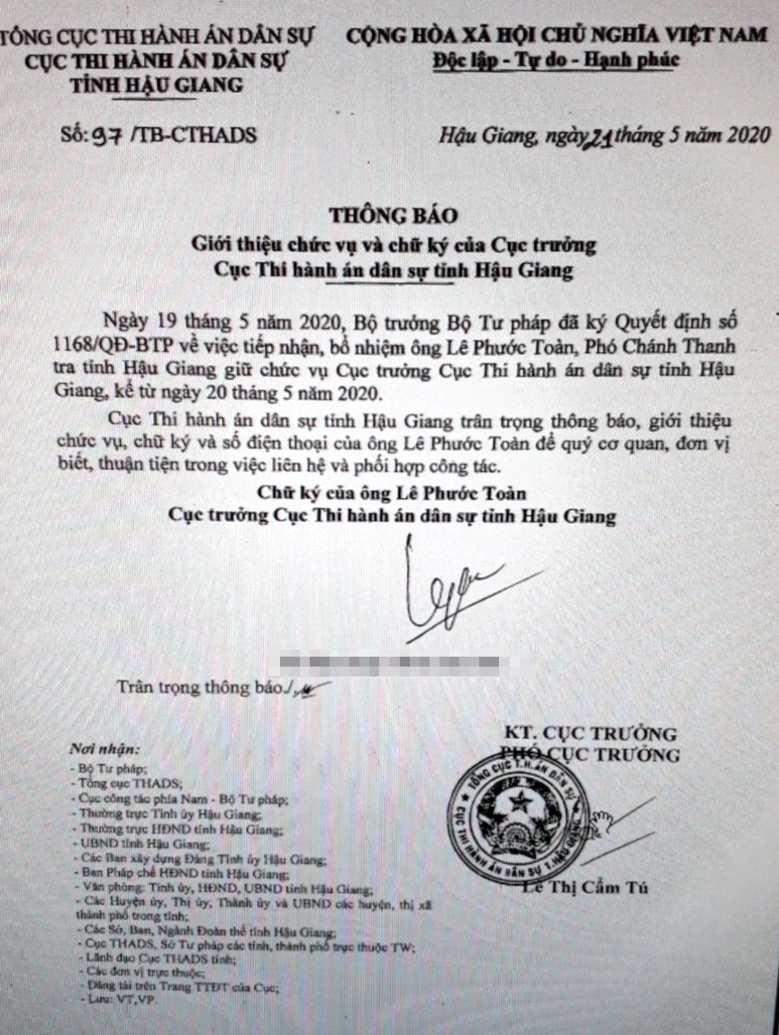 Cục Thi hành án dân sự (THADS) tỉnh Hậu Giang vừa có văn bản giới thiệu chức vụ và chữ ký tân Cục trưởng Lê Phước Toàn.