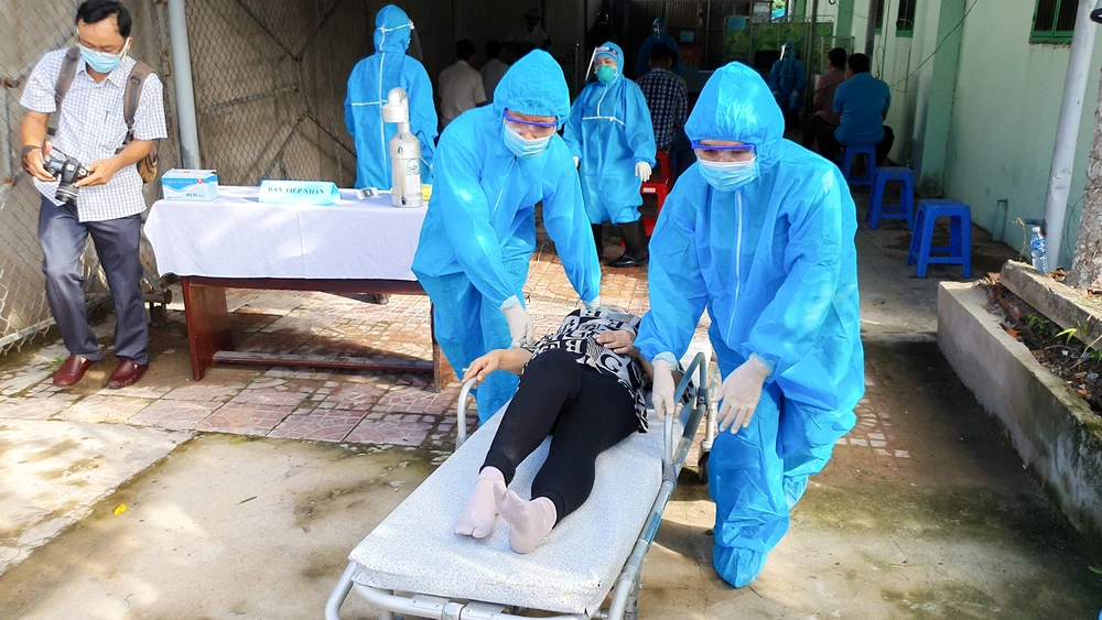 Diễn tập phong tỏa một khu vực để ứng phó dich COVID-19 ở TP Vị Thanh (Hậu Giang). Ảnh: CHÂU ANH