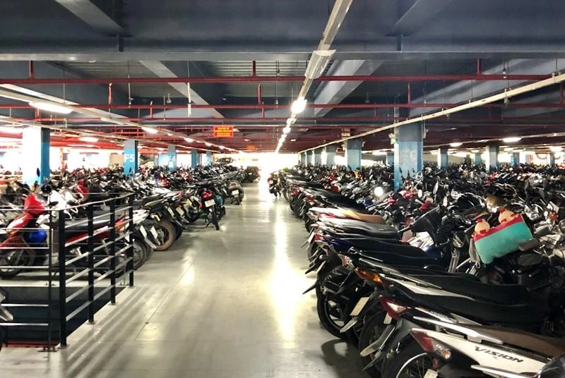 Xe máy gửi kín hai tầng 1 và 2 của nhà giữ xe trước ga quốc nội Cảng hàng không quốc tế Tân Sơn Nhất. Ảnh: P.ĐIỀN
