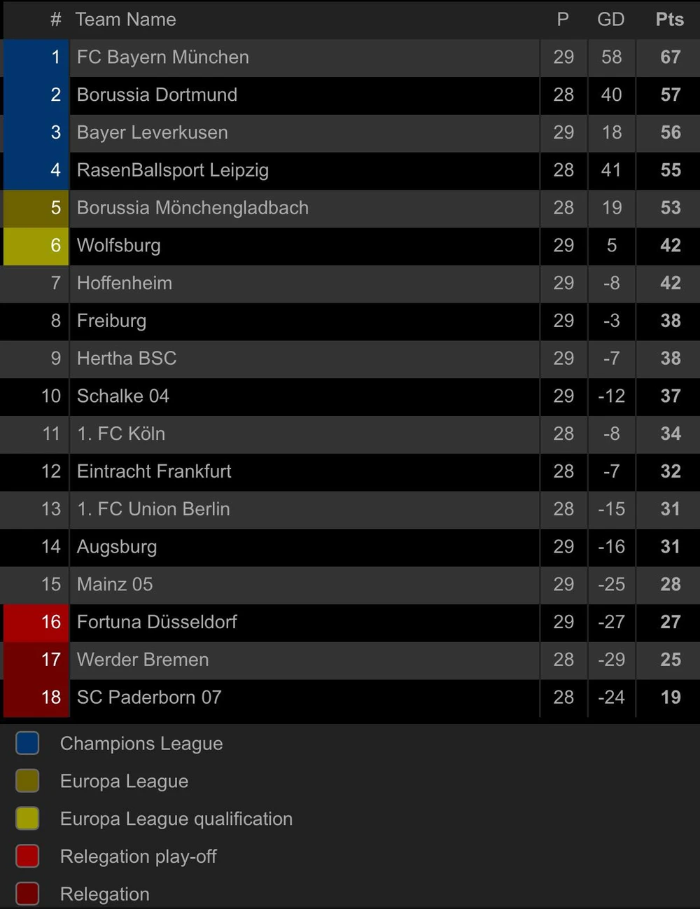Trong khi đó, Fortuna Dusseldorf rơi xuống vị trí thứ 15, đồng nghĩa với việc nằm trong nhóm xuống hạng.
