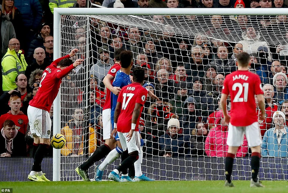 ... để bóng đập người Lindelof bay vào lưới biếu không cho Everton bàn thắng.