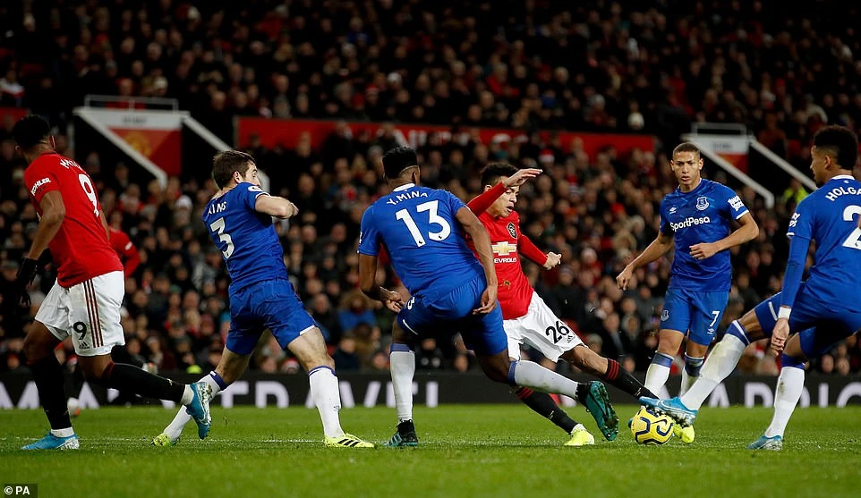 Mason Greenwood tự tin dứt điểm giữa rừng hậu vệ Everton để gỡ hòa 1-1 cho MU.