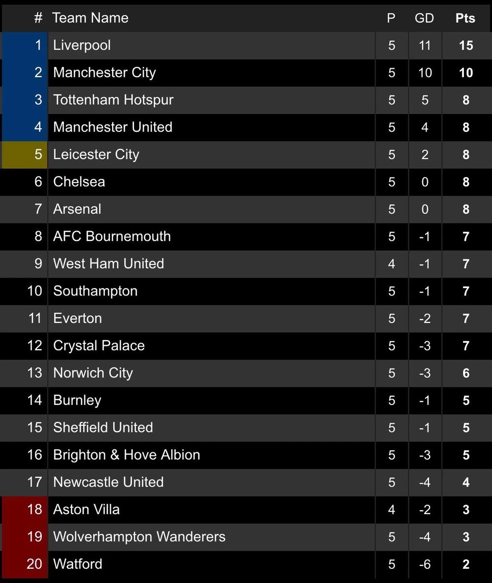 Với kết quả hòa thất vọng 2-2 trên sân của Watford, Arsenal đánh mất cơ hội có được vị trí trong Top 4. Sau 5 vòng đấu các “pháo thủ” có được 8 điểm nhưng đứng ở vị trí thứ 7 do thua các đối thủ về hiệu số bàn thắng.
