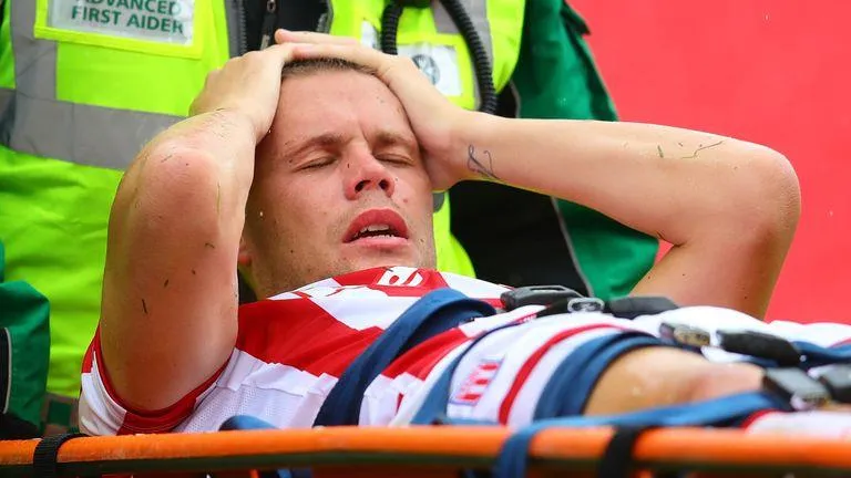 Hậu vệ Ryan Shawross nằm cáng cứu thương trước khi rời sân. ẢNH: GETTY IMAGES