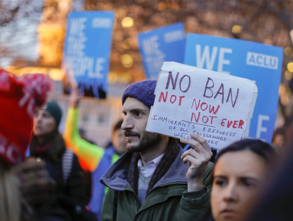 Những người biểu tình tập hợp bên ngoài Nhà Trắng ở thủ đô Washington hôm 7-3 để phản đối sắc lệnh cấm nhập cảnh sửa đổi của ông Trump. Ảnh: EPA