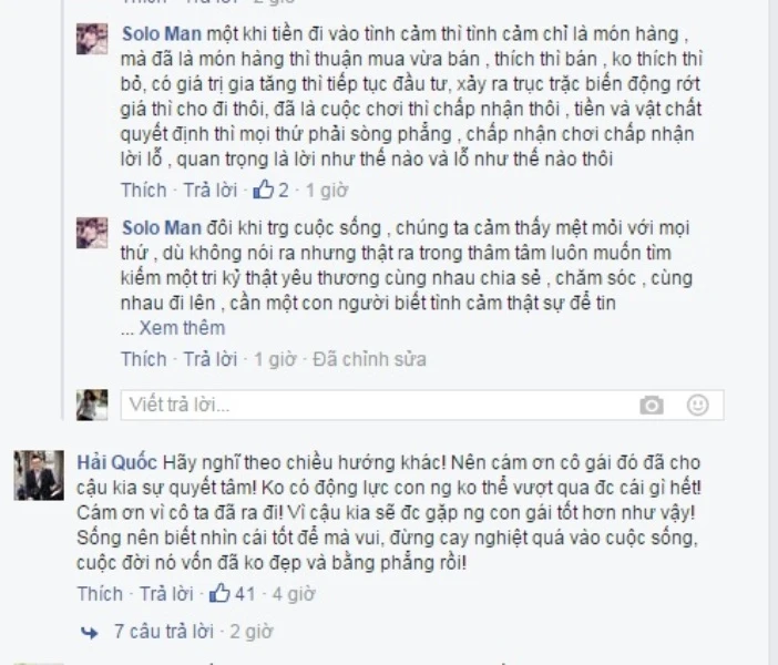 “Hãy nghĩ theo chiều hướng khác! Nên cám ơn cô gái đó đã cho cậu kia sự quyết tâm! Không có động lực con người không thể vượt qua được cái gì hết! Cám ơn vì cô ta đã ra đi! Vì cậu kia sẽ được gặp người con gái tốt hơn như vậy! Sống nên biết nhìn cái tốt để mà vui, đừng cay nghiệt quá vào cuộc sống” - Facebook Hải Quốc chia sẻ.