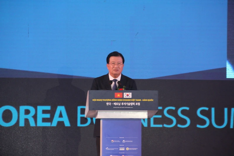 Sáng 9-11, Phó Thủ tướng Chính phủ Trịnh Đình Dũng dự "hội nghị thượng đỉnh kinh doanh Việt Nam - Hàn Quốc" diễn ra tại Khu phức hợp Thaco Chu Lai (huyện Núi Thành, Quảng Nam).