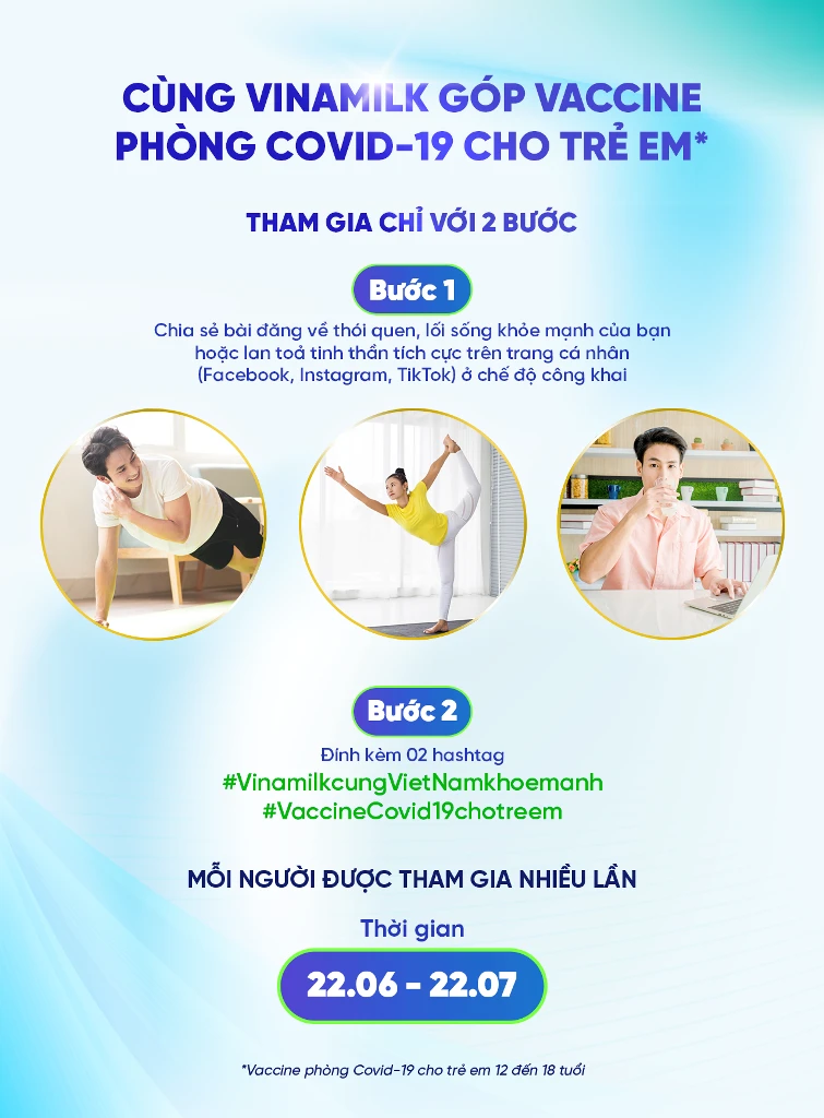 “Để khích lệ điều này, Vinamilk đã thực hiện hoạt động đầu tiên của chiến dịch, đó là kêu gọi mọi người hãy chia sẻ về lối sống khỏe mạnh và tinh thần lạc quan của mình. Qua mỗi bài đăng của các bạn, Vinamilk sẽ góp 50.000 đồng, với ngân sách cam kết là 10 tỷ đồng dùng cho việc mua vaccine phòng COVID-19 cho trẻ em”, ông Nguyễn Quang Thái, Giám đốc Phát triển Hoạt động Cộng đồng, đại diện Vinamilk cho biết.
