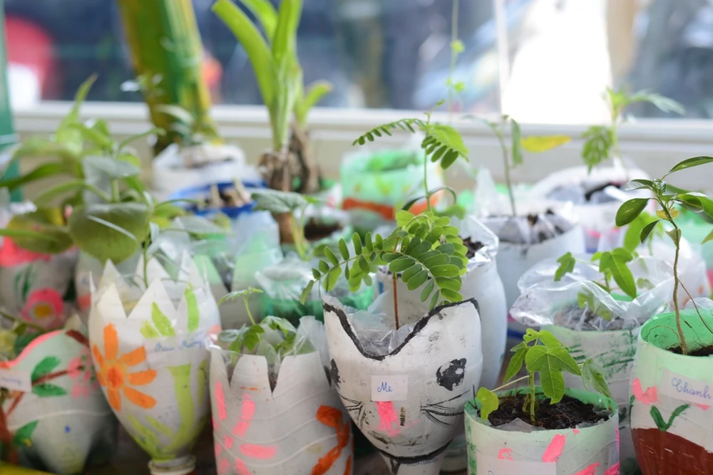 Đồ dùng được làm từ vật liệu tái chế do các em học sinh thực hiện. Ảnh: MT