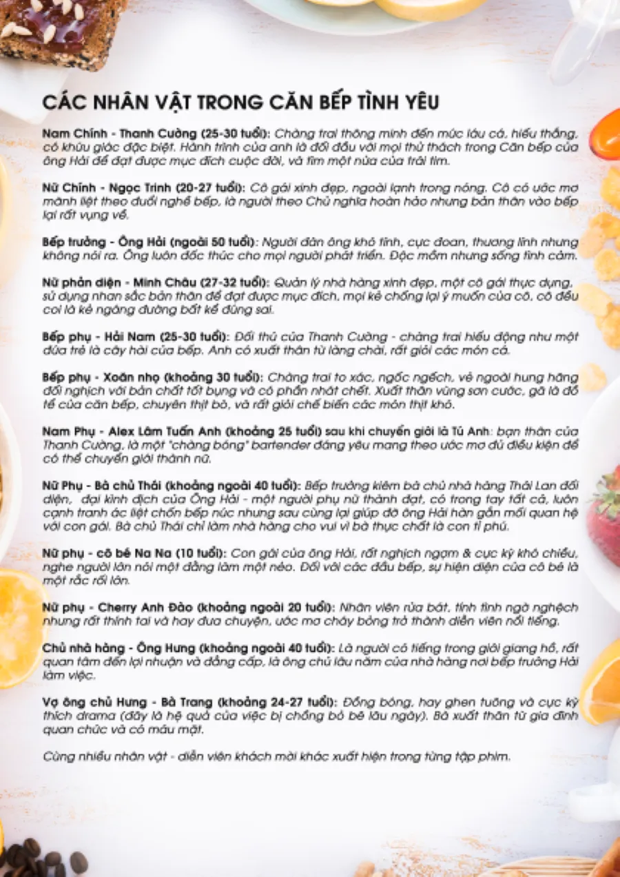 Bộ phim sẽ xoay quanh câu chuyện về tình bạn tình yêu, tình đồng nghiệp. Đan xen những gia vị ấm áp cùng những tình huống hài hước được thực hiện khéo léo trên nền của các nền văn hoá ẩm thực đến từ khắp nơi trên thế giới đặc biệt là ẩm thực Việt.