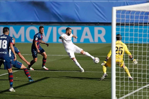 Đến phút cuối hiệp 1, Karim Benzema dứt diểm cận thành chính xác ghi bàn giúp Real Madrid khép lại hiệp một với lợi thế dẫn trước 2-0.