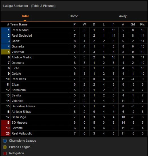 Với 3 điểm có được ở trận này, Real Madrid vươn lên ngôi đầu bảng La Liga với 16 điểm, hơn đội xếp thứ nhì Real Sociedad 2 điểm.