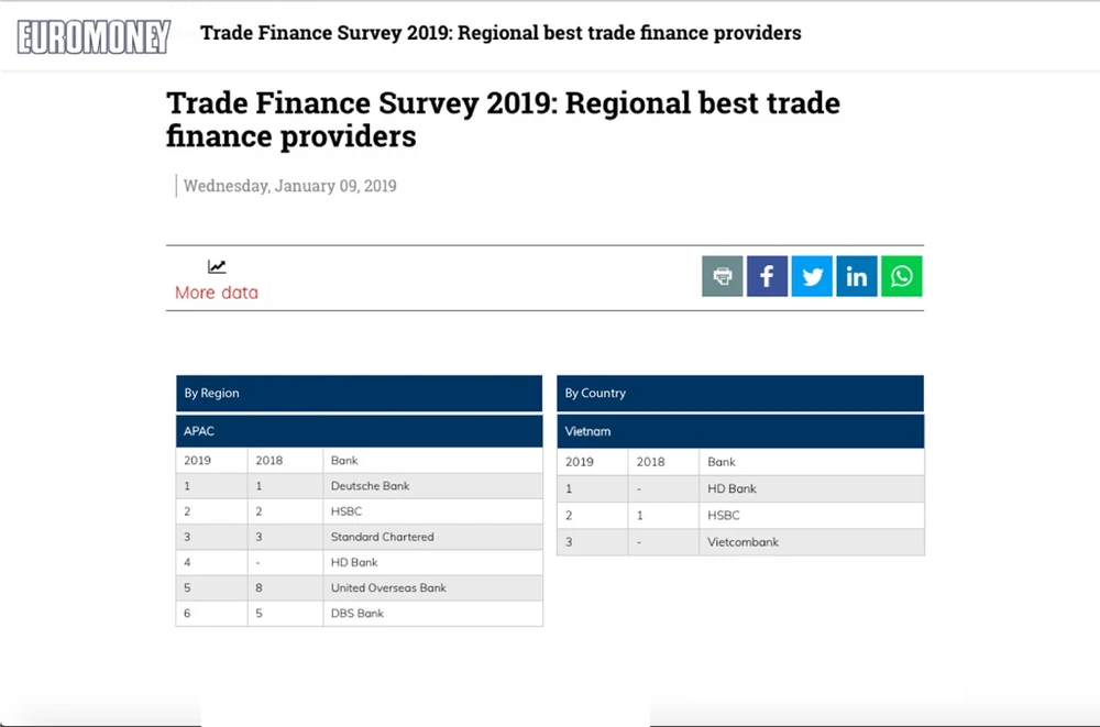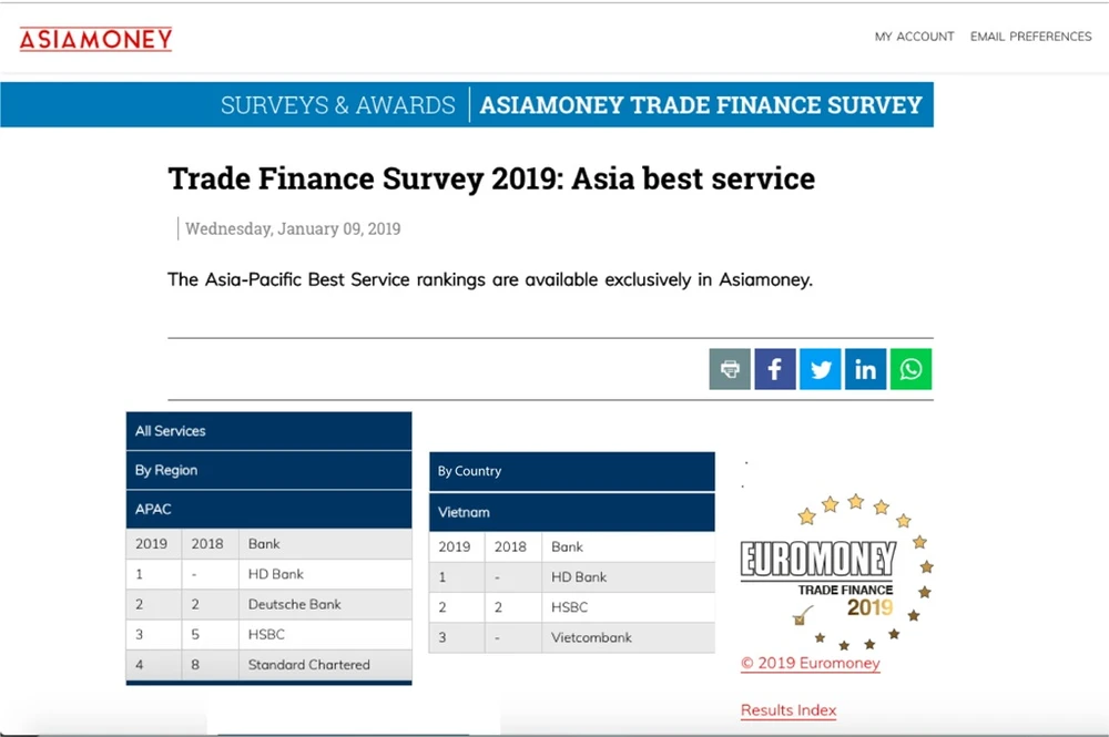 Với Giải thưởng “Dịch vụ Tài trợ thương mại” dẫn đầu Châu Á – Thái Bình Dương, HDBank tiếp tục khẳng định vị thế thương hiệu của một trong những ngân hàng TMCP lớn nhất tại Việt Nam khi được nhiều tổ chức trong và ngoài nước trao các giải thưởng uy tín. Trong đó tiêu biểu như: “Ngân hàng có dịch vụ Quản lý tiền mặt tốt nhất 2018” tại khu vực châu Á – Thái Bình Dương do tổ chức Euromoney trao tặng, “Doanh nghiệp quản lý tốt nhất” tại khu vực Châu Á trong 2 năm liền, “Ngân hàng tốt nhất năm 2017”, “Best Cash Management in Vietnam – Ngân hàng Quản lý tiền mặt tốt nhất Việt Nam” trong 5 năm liền (2012, 2013, 2014, 2015 và 2016), giải Bạch kim Báo cáo thường niên của Hiệp hội truyền thông Mỹ (LACP), “Nơi làm việc tốt nhất Châu Á” của HR Asia…
