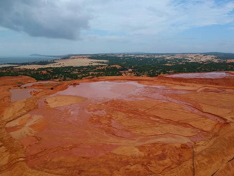HĐND tỉnh Bình Thuận yêu cầu làm rõ nguyên nhân vì sao mỏ khai thác titan tạo ra những hồ bùn đỏ khổng lồ, chực chờ gây họa cho môi trường. Ảnh: KB
