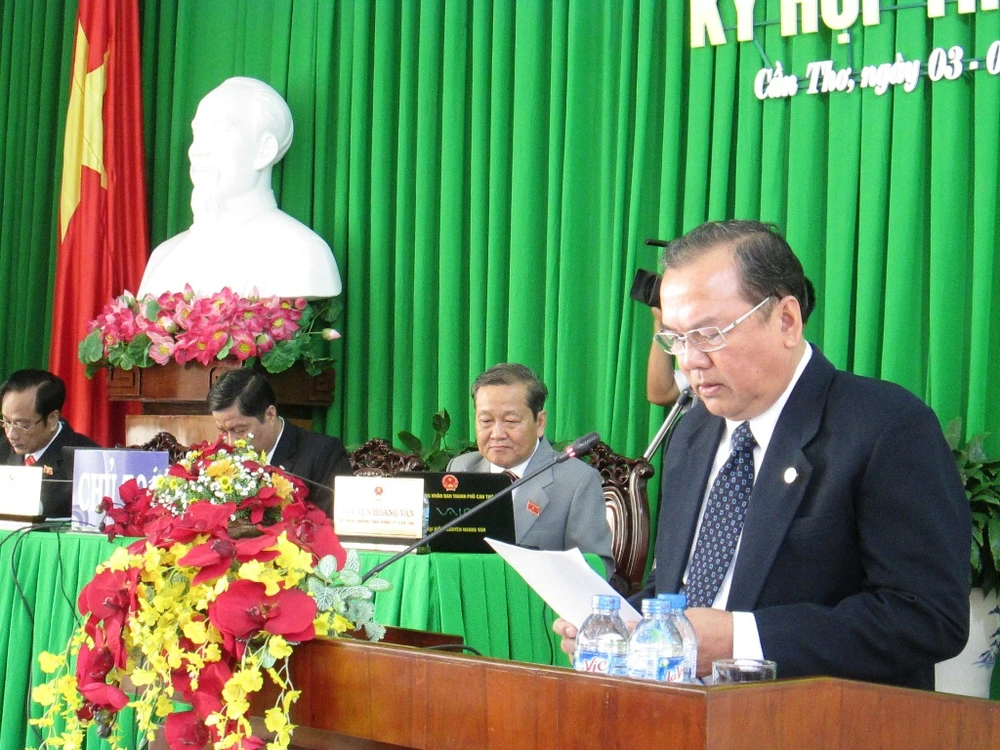 Chủ tịch UBND TP Cần Thơ Lê Hùng Dũng báo cáo tại kỳ họp về tình hình thực hiện nhiệm vụ kinh tế - xã hội năm 2014 và kế hoạch năm 2015. Ảnh: N.NAM