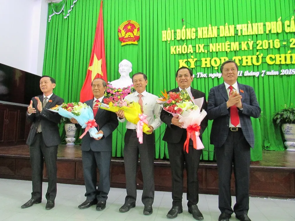 Lãnh đạo HĐND, UBND TP Cần Thơ tặng hoa chúc mừng các ông Mai Như Toàn, Nguyễn Tấn Dược, Nguyễn Văn Dũng (những người cầm hoa từ phải qua trái). Ảnh: NN