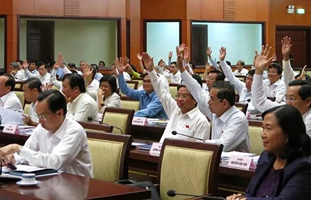 Đại biểu HĐND TP.HCM biểu quyết thông qua nghị quyết về các vấn đề cấp bách tại kỳ họp bất thường ngày 11-9. Ảnh: B.MINH
