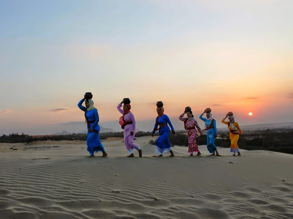 Chắc nhiều người đã từng trầm trồ về những bức ảnh thiếu nữ Chăm áo váy xanh đỏ, xếp hàng, đầu đội bình gốm, sải chân trên các triền cát giữa chói chang mặt trời xứ sa mạc.