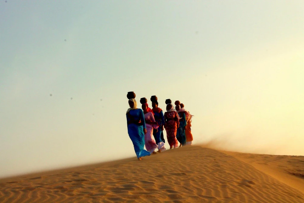 Những phụ nữ Chăm đầu đội bình gốm sải chân trên triền cát. Ảnh: NÚI XANH