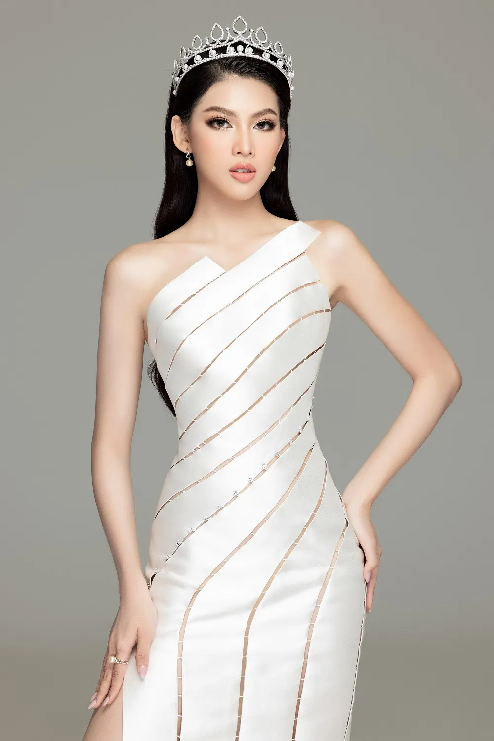 Bám sát tiêu chí của cuộc thi Miss Grand International (Hoa hậu Hoà bình Thế giới), NTK Linh San đã chọn lựa các tông màu trắng - vàng - xanh để phác thảo lên những bộ cánh đa dạng.