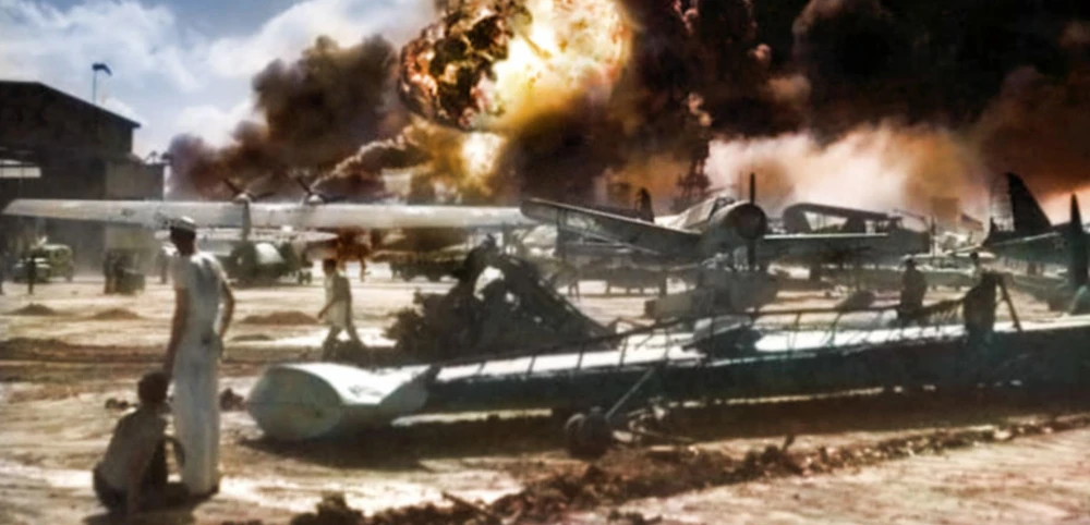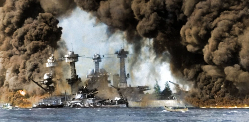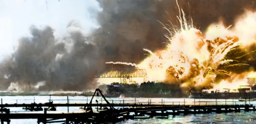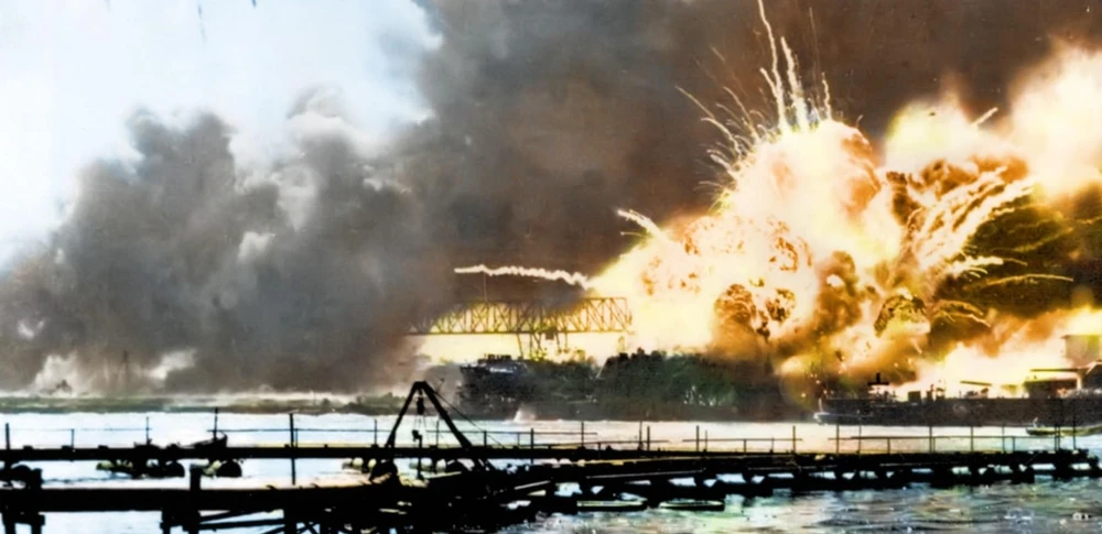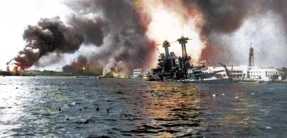 Vào lúc 7 giờ 55 phút sáng 7-12-1941, máy bay ném bom của Nhật đã tấn công vào căn cứ hải quân Trân Châu Cảng ở Hawaii với mục đích đánh chìm hạm đội hải quân Thái Bình Dương của Mỹ đang neo đậu. Ảnh: DAILY MAIL