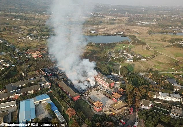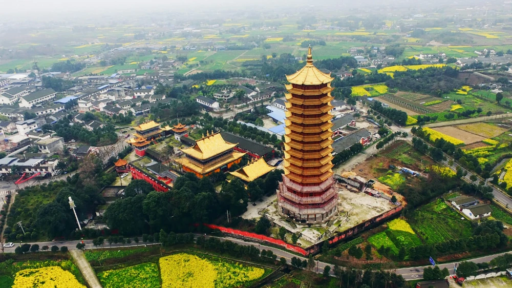 Vào năm 2008 tòa tháp từng bị sụp đổ trong một trận động đất kinh hoàng làm rung chuyển Tứ Xuyên. Đến năm 2010, quần thể kiến trúc rộng 800 m2 với ba công trình được phục dựng trở lại. Tuy nhiên, công cuộc phục dựng chưa hoàn thành thì xảy ra trận hỏa hoạn lần này.