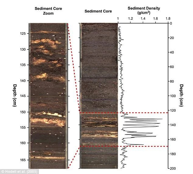 Sự khác biệt trong lớp vật chất khi các nhà khoa học giám định mẫu đất bùn đáy hồ. Lớp khoáng thạch cao chứng tỏ lượng mưa khan hiếm trong thời gian dài (bên trái), lớp mùn thực vật chứng tỏ lượng mưa dồi dào (bên phải.) Ảnh: Hodell.