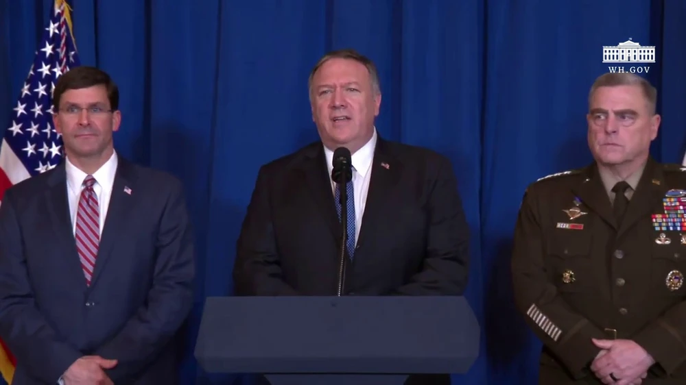 Ngoại trưởng Mỹ Mike Pompeo (giữa) cùng Bộ trưởng Quốc phòng Mark Esper (trái) và Chủ tịch Hội đồng Tham mưu trưởng Liên quân Mỹ Mark Milley (phải). Ảnh: WHITE HOUSE